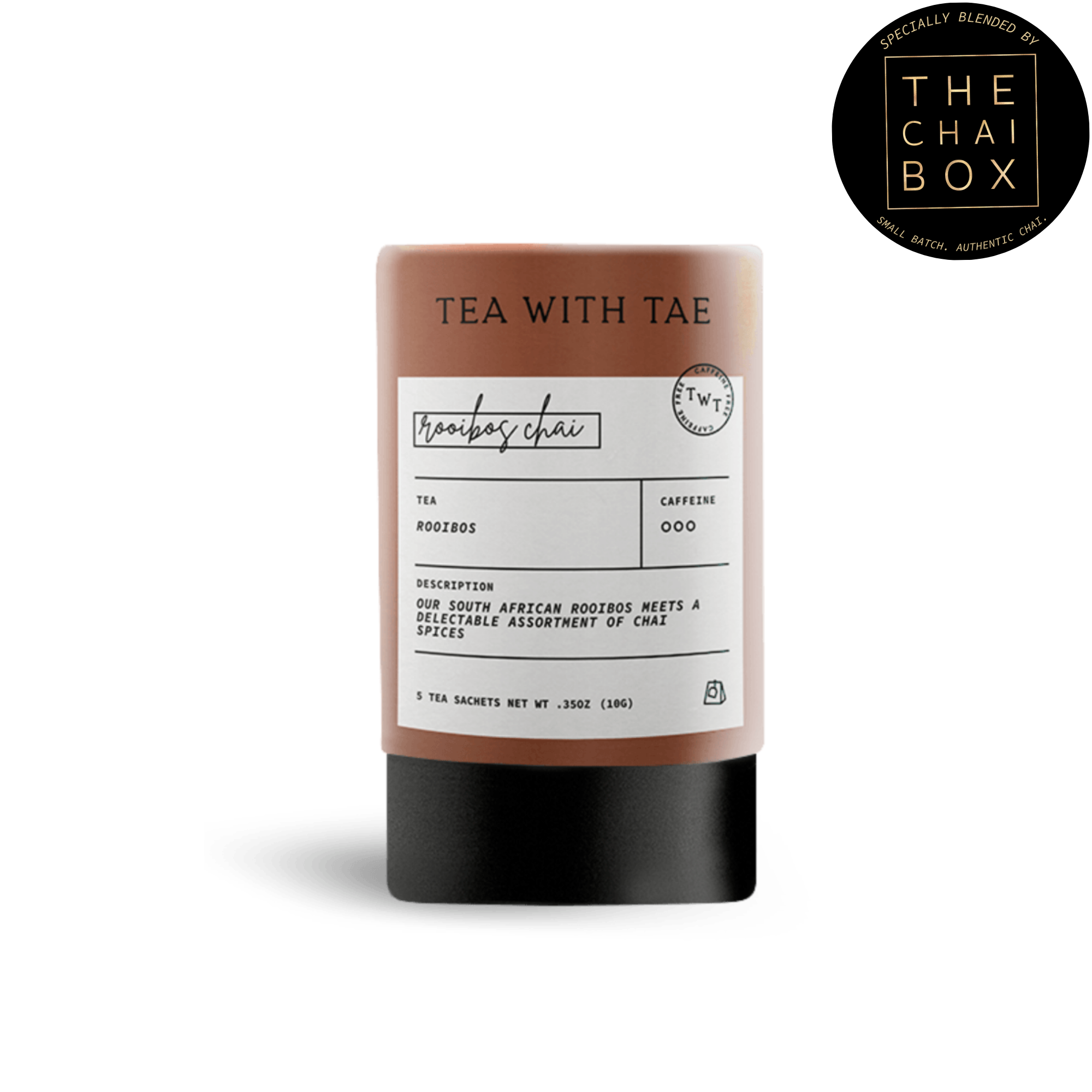 ROOIBOS CHAI (DECAF): Specially blended for TWT by The Chai Box! Our full-bodied South African Rooibos meets the delectable chai spices of cinnamon, cardamom, ginger, and cloves. The rooibos bushes are rosemary-type shrubs indigenous to a small area of the arid Western Cape, and the chai spices are traditional to India.